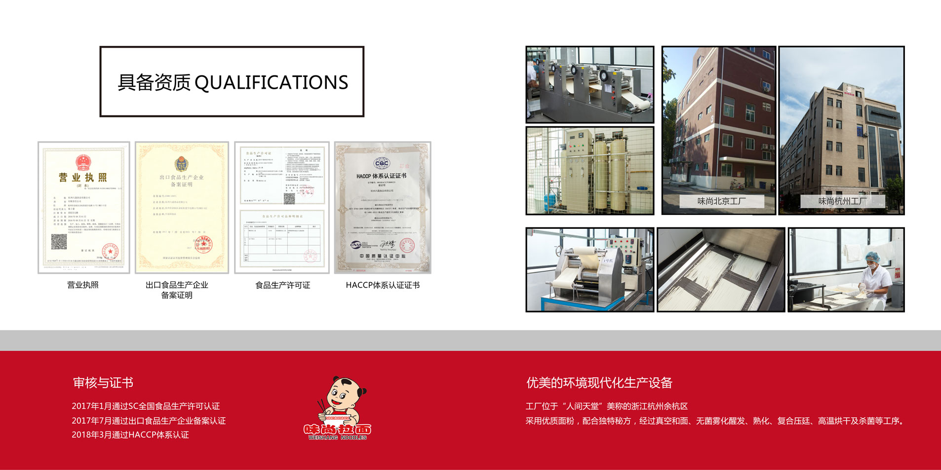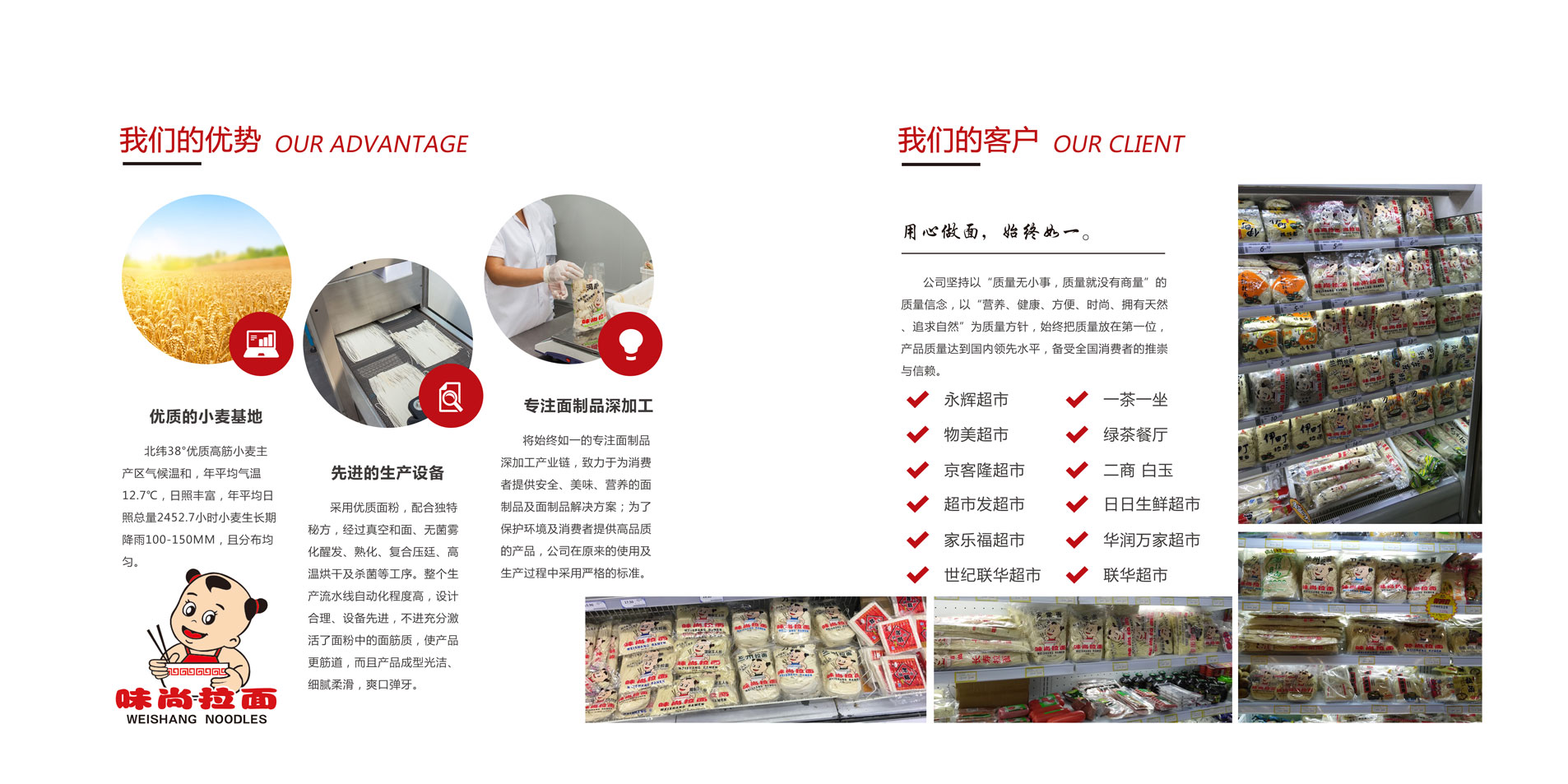 北京市味尚食品有限公司是一家專業生產日式拉面、中式保鮮生濕面的食品企業。公司成立于2009年6月,位于北京市順義區牛欄山開發區。公司引進全套日本自動生產線,并與我國傳統制面工藝相結合,研發出“味尚”品牌--家常面、雞蛋面、刀削面、長壽面、北方拉面、蘭州拉面、日式拉面、炸醬面等八大高端系列產品。